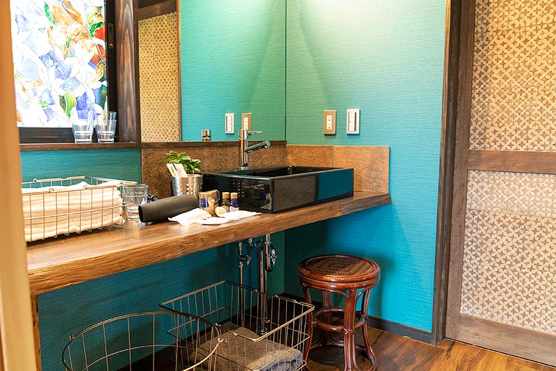 洗面には、タオル、アメニティ、ドライヤー、椅子などをご用意。