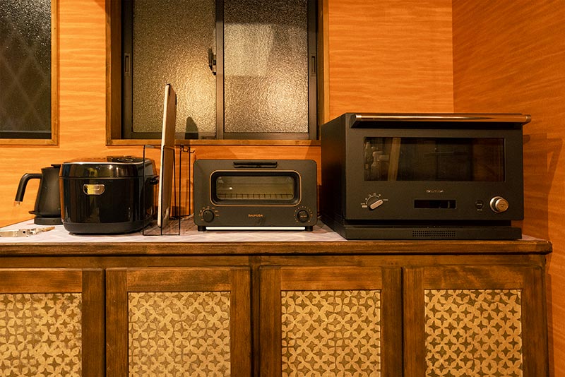 電子レンジ、オーブン、炊飯ジャー、湯沸かし器などひと通り揃えております。